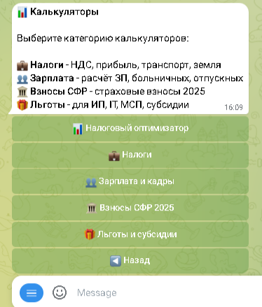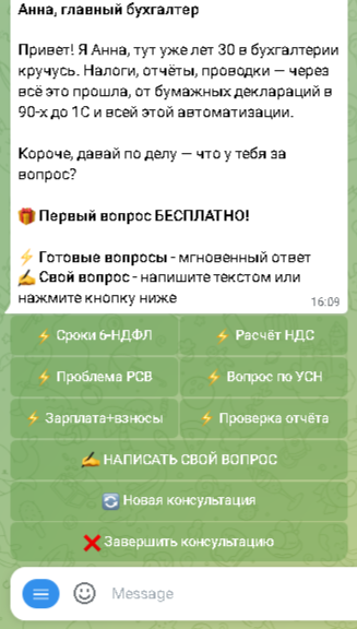 Революционная функция AI-консультанта на базе нейросети Claude Sonnet 4.5 предоставляет профессиональные разъяснения по вопросам налогообложения, бухгалтерского учёта и заполнения отчётности. Виртуальный специалист работает под образом опытного главного бухгалтера с тридцатилетним стажем, отвечая на вопросы о применении статей Налогового кодекса, выборе оптимальной системы налогообложения, расчёте налоговых вычетов и льгот.
