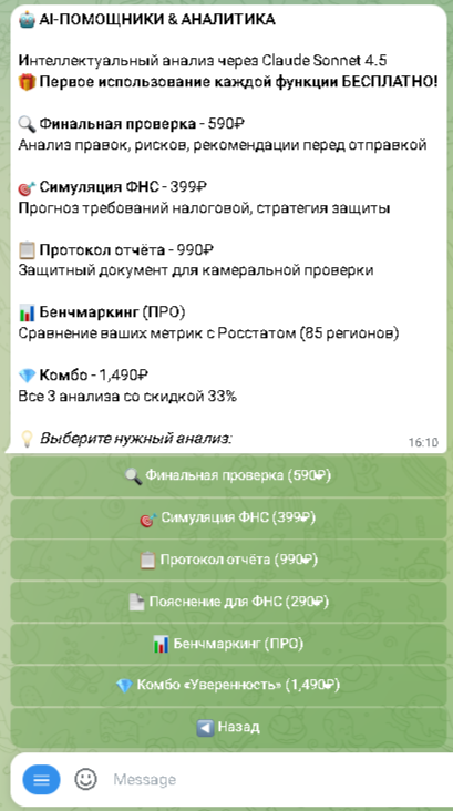 Начните проверку отчётности прямо сейчас – первые десять проверок бесплатно без ограничений функционала. Телеграм-бот работает круглосуточно, обрабатывая документы за считанные минуты и предоставляя результаты в удобном формате PDF с детальными пояснениями. Сэкономьте время на рутинных проверках, минимизируйте риски претензий со стороны налоговых органов, получите персонализированные рекомендации от искусственного интеллекта по оптимизации налоговой нагрузки. Присоединяйтесь к тысячам бухгалтеров и предпринимателей, доверивших проверку отчётности умным технологиям машинного обучения и экспертным алгоритмам валидации.